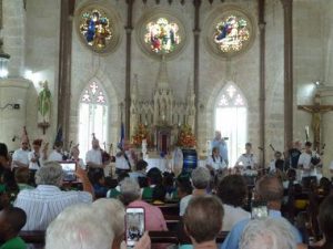 On Wednesday we had our first concert at St Patrick’s Cathedral, and met up with Sister Pauline, who was the head of St Patrick’s Junior School. Sister Pauline was also from Scotland and had been playing guitar with Riddell Fiddles, the night before. The concert was scheduled to start at 1.00pm, and this was the first time that we realised that Bajan time was fairly relaxed, as the buses to take us to the concert didn’t turn up until 12.45pm…and then there were not enough seats for everyone, so they had to make 2 journeys!! The concert eventually got underway at 1.15pm. However, it was a lovely event where the local school choir sang ‘Loch Lomond’, in a wonderful Scottish accent, accompanied by Sister Pauline and they also did a few dances. They then sang ‘Beautiful, Beautiful, Barbados’, which we had learnt and were able to join in with them. We then sang three items, but, because all the windows and doors were open and a breeze was going through the cathedral, the acoustic was lost. Rhian and Nick also had problems with their music being blown around! The concert finished with the combined pipers from the Reading Scottish Pipe Band and the Strathallan School Pipe Band, under their Musical Director, Craig Muirhead. What a wonderful sound! The rest of the day we had to ourselves, so it was back to the beach for more sun.Â