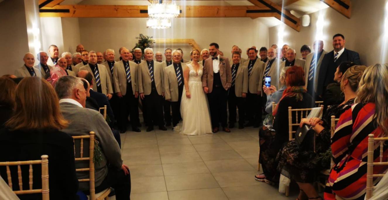 Our singing was due to take place after the wedding ceremony and as we were late the guests had been sent off to the bar to await our arrival. Once we arrived we assembled and the guests returned, with drinks in hand, and in a very happy mood. We sung six numbers: ‘Calon Lan’, ‘You Are So Beautiful’, ‘O Gymru’, ‘Can’t Take My Eyes Off You’ (with audience participation), ‘Gwahoddiad’, and ‘God Only Knows’ which were all rapturously applauded. For an encore we sang ‘There Is A Land’ and ‘Mae Hen Wlad Fy Nhadau’ and the guests had to sing one chorus on their own. We left the hall to more applause and many thanks from the Bride, Groom and guests.