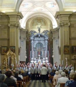 We took a party of 72, with choristers and ‘wags’, and left Swansea at 6.30am on Thursday morning. We flew from Gatwick and arrived at our destination in time for an evening meal in the Hotel Abbazia, which was to be our base for the weekend. We had a lazy day on Friday before going to our first concert, which was in Udine. We left in plenty of time to have a wander around the town and then went to Chiesa di San Marco Evangelista and met with our host choir, Corale ‘San Marco’ di Udine. We had a quick rehearsal with them and then waited for the concert to begin. The church was packed and Corale ‘San Marco’ started their set with ‘Signore delle cime’, and they sang beautifully. We were then introduced and started with ‘Morte Criste’ with Rhian on piano and Steve on the organ and we had a huge ovation. This continued throughout our performance and a really enjoyable evening was had by all with both choirs joining to finish with ‘Ave Maria’ by Beppi De Marzi, which is a really powerful piece of music. During the evening, as a surprise, we sang ‘Nella Fantasia’, which we had learnt in Italian and this was also very well appreciated. We were treated to a 3 course meal after the concert and there was plenty of wine being passed around. Many thanks to Corale ‘San Marco’ for allowing us to perform with them, and providing us with very generous hospitality. There is talk that they may come over to Swansea in the future and we really hope they do. We must also thank Antonella Zoratti for welcoming us and introducing each choir. Antonella was also a great help to us as she organised the event and helped with posters and advertising, which ensured such a successful concert.
