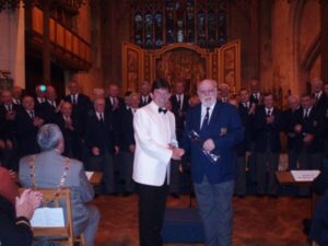 The following Saturday we took part in the Navy Days celebration in Mumbles and gave a concert at All Saints, Oystermouth. On this occasion we were joined by Celine Forrest, soprano, and Zoe Rasmussen, harp. The evening was organised by Penny Ryan and we were fortunate to have Les Ryan accompany us on the organ for 3 pieces. We sang Geoffrey Russell Smith’s arrangement of ‘Li’l Liza Jane’ for the first time and during the concert we presented a tie to Ray Davies for 30 years’ service to the choir.