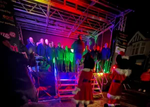 The switching on of the Mumbles Christmas Lights event is always a very special occasion and in spite of the inclement weather Mumbles put on a good show! A canopy was in place outside the Ostreme Centre and there was a great atmosphere. The choir assembled to the sound of a lively band, colourful Disney characters, Christmas stalls and games.  The Mayoress then opened the event with a fireworks display and the Christmas lights were turned on so Mumbles shone brightly for all to see!